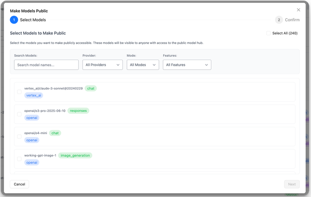 Admin can select models/agents to expose on public AI hub → Users go to the public url and see what's available.